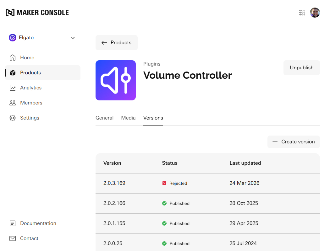 List of Volume Controller versions in Maker Console, with a rejected submission.