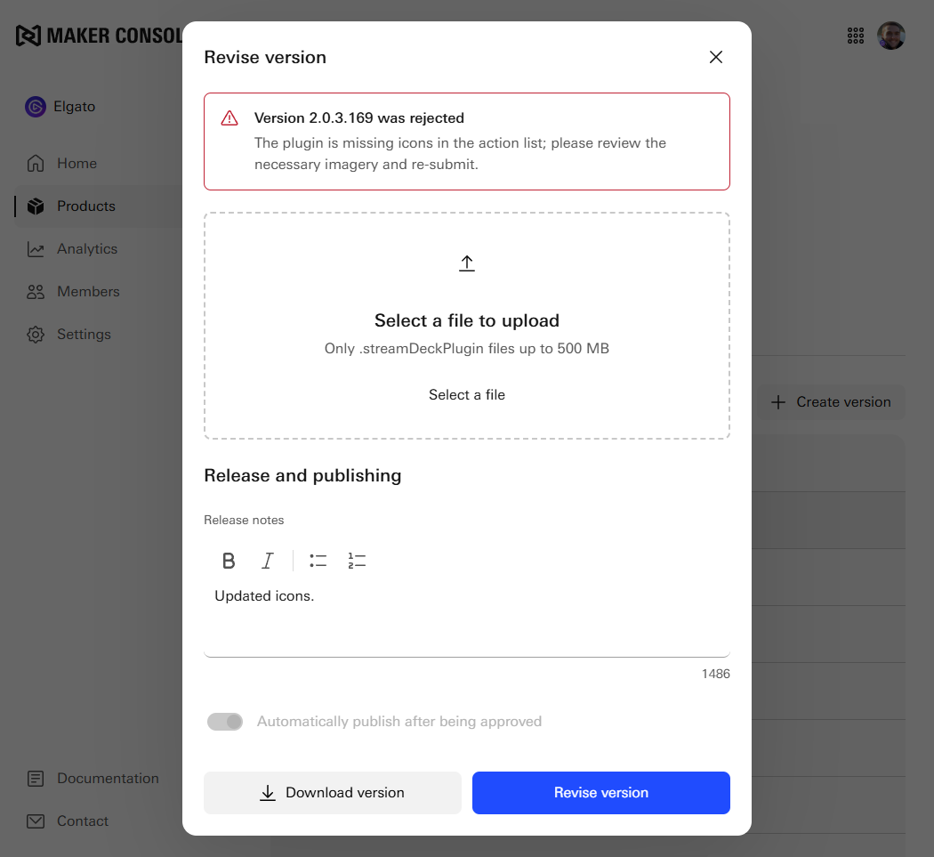 To submit a revision, log into Maker Console, select Products and the product you wish to revise, and then the Versions tab.
